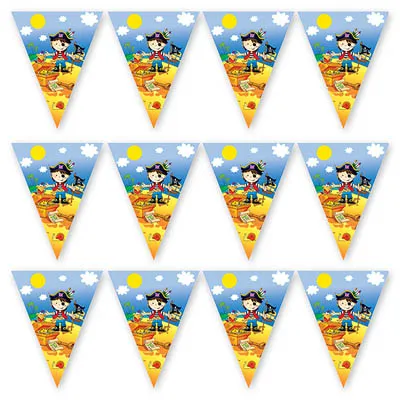 Необитаемый остров с сокровищами Флинта - мечта каждого пирата! А если еще и клад оказался не тронутым! На море штиль и светит солнце, счастливый пират стоит у открытого сундука с сокровищами! Гирлянда из флажков с таким сюжетом будет прекрасно смотреться на пиратской вечеринке!