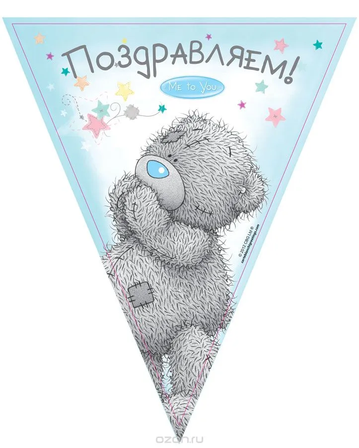Нежно-голубые флажки с трогательным медвежонком Me to You и надписью"Поздравляем" так и хотят стать украшением дома, где встречаютноворожденного или отмечают детский праздник! Длина гирлянды: 360 см,выполнена из полиэтилена.
