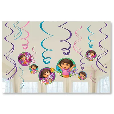 Блестящие голубые, сиреневые и розовые спиральки с подвешенными к ним медальонами с Дашей и Башмачком! Длина спиралей варьируется от 46 до 60 см. Шесть спиралек с яркими картинками с Дашей, а остальные просто цветные! Каждая спираль снабжена колечком для крепления к потолку или стене.