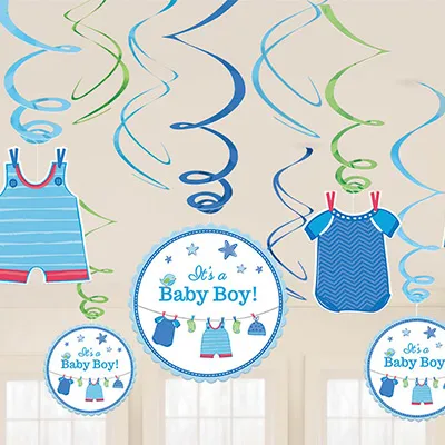 Голубые, синие и салатовые спирали с комбинезонами и боди, и кружочками с бельевыми веревками. В наборе 6 простых блестящих спиралей и 6 с подвесными картинками. Поздравляем с рождением сына! Длина спиралей от 46 до 60 см, Вы можете сами варьировать длину. Каждая спираль снабжена колечком для крепления к потолку или стене.