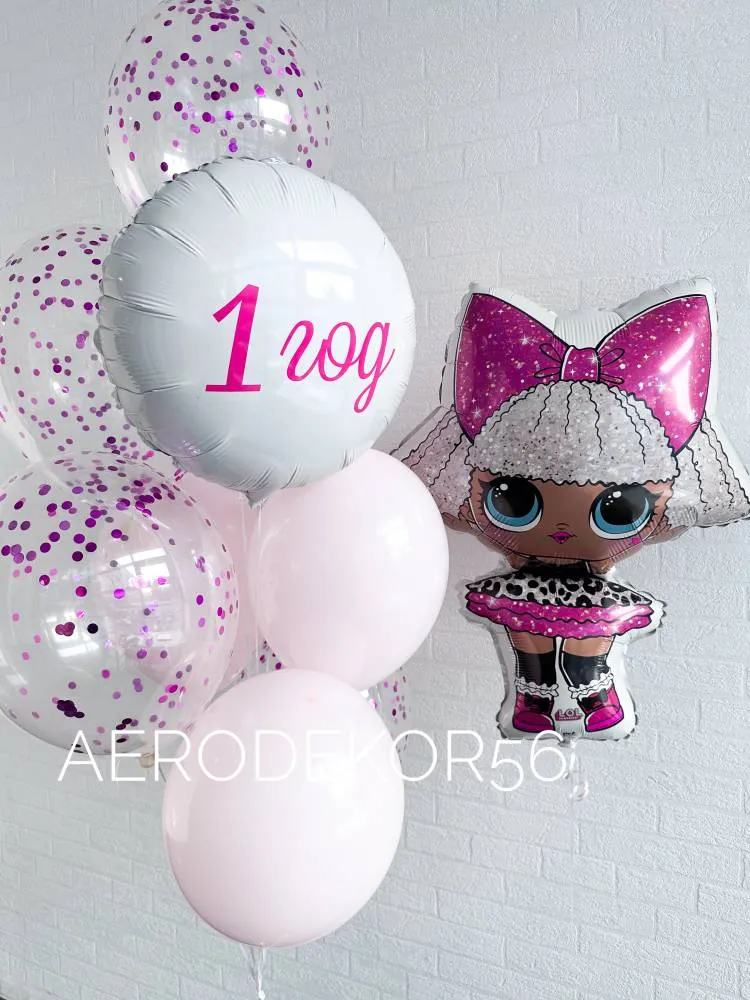 шар с конфетти 4шт, латексный шар 4шт, фольгированный круг с индивидуальной надписью 1шт, фольгированная кукла лол 1шт, грузик 2шт