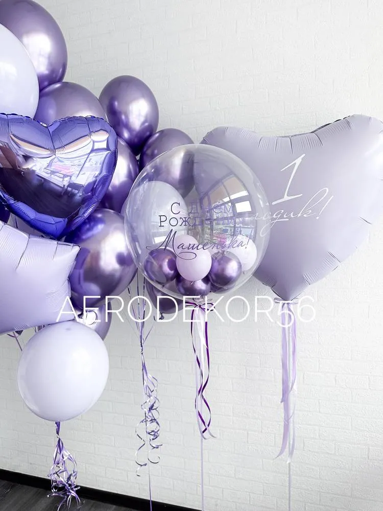 фольгированная звезда 1шт, фольгированное сердце 1шт, фольгированное сердце с индивидуальной надписью 1шт, баблс с индивидуальной надписью и наполнением 1шт, латексный шар 5шт, хромированный шар 10шт, грузик 3шт