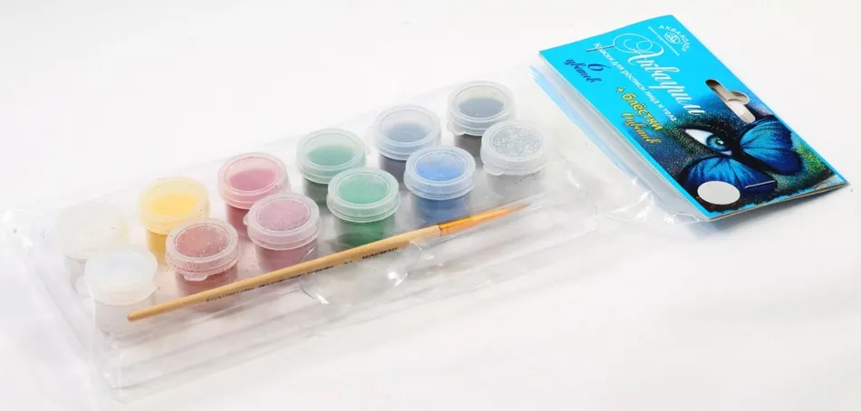 Водные пастообразные художественные краски для росписи лица и тела (краски аквагрим пастообразные) используются в искусстве росписи тела БОДИ-АРТ, для разрисовки лица на детских праздниках и маскарадах. Наносятся кистью. Краски не токсичны (свидетельство о государственной регистрации № RU.40.01.05.001.Е.005927.11.11 от 21.11.2011, экспертное заключение № 053-11-Э3 от 09.11.2011), смываются теплой водой с любым моющим средством для лица (тела). Не давать детям до трех лет, т.к. краски не съедобны. Возможна индивидуальная непереносимость. Набор АКВАГРИМ С БЛЕСТКАМИ: краски для росписи лица и тела пастообразные 6 цветов (белый, красный, жёлтый, зелёный, синий, чёрный) + сухие блестки (глиттеры) 6 цветов (белый перламутровый, розовый, бронза, зелёный, синий, серебро) в баночках по 3 мл, с кисточкой. Упаковка блистер.