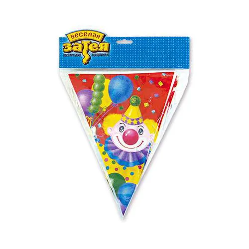 Гирлянда-вымпел "Клоун с шарами" представлена в размере 360 см в длину. Гирлянда выполнена с изображением в виде веселого клоуна, у которого в руках воздушные шарики. Она изготовлена из плотного материла, благодаря которому ее легко содержать в чистоте и она сможет прослужить дольше, чем бумажные гирлянды. Такая гирлянда-вымпел поможет украсить помещение к веселому детскому торжеству.