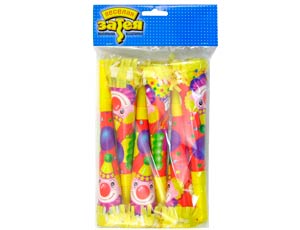Свистульки с бахромой, ярко раскрашенные с изображением клоуна - для карнавала, для рождения и праздника. Издают резкий, пронзительный свист. Свистулька состоит из картонного корпуса с пластиковым мундштуком-свистулькой.
