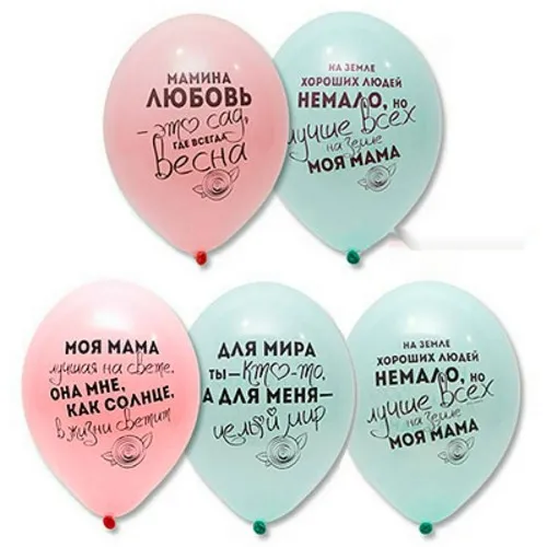 Высококачественный шар из натурального латекса. Ассорти из нескольких цветов. Одного типа - пастель - матовый оттенок цвета. Шары с двусторонним шелкографическим рисунком повсященных Маме, в пакете с большим полем печати. "На земле хороших людей немало, но лучше всех на земле моя мама", "Мамина Любовь - это сад, где всегда весна", "Моя мама лучшая на всете, она мне как в солнце в жизни светит", "Для мира ты кто-то, а для меня - целый мир", "Я не лучший из детей, но ты - лучшая из мам". Идеальный ассортимент для розничной продажи воздушных шариков и украшения праздника.