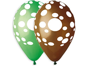 Воздушные шары из натурального латекса c шелкографическим одноцветным рисунком в виде точек-пятен нанесенным по всему шару. Используемые цвета шаров #12 (зеленый) и #48 (коричневый) с белыми разноразмерными точками-пятнами имитируют окрас динозавра. Предназначенны для использования как в оформлении, так и в розничной продаже.