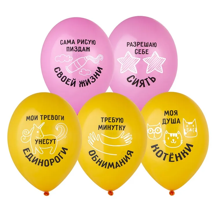 Высококачественный шар из натурального латекса. Ассорти из трех цветов, одного типа - пастель - матовый оттенок цвета. Шары с двусторонним шелкографическими рисунком - надписями: Круглосуточно красивая. Волшебная на всю голову. Злючке и врединке. Ты Ангел на 99%. Ох уж этот 1%... Не женское это дело - молчать. Милашке и красавице. Идеальный ассортимент для розничной продажи воздушных шариков и украшения праздника. Воздушные шары изготавливаются из экологически безопасного 100%-ного натурального латекса. В окружающей среде разлагаются на безопасные компоненты примерно с той-же скоростью, как обычные листья деревьев. После использования лопнуть и утилизировать как бытовой отход.