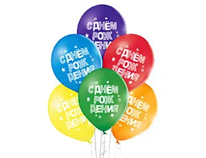 Высококачественный шар из натурального латекса. Ассорти из 6 цветов (красный, синий, зеленый, желтый, фиолетоывй, оранжевый), одного типа - пастель - матовый оттенок цвета. Шары с двусторонним шелкографическим рисунком на тему "День Рождения" с большим полем печати. Идеальный ассортимент для розничной продажи воздушных шариков и украшения праздника.