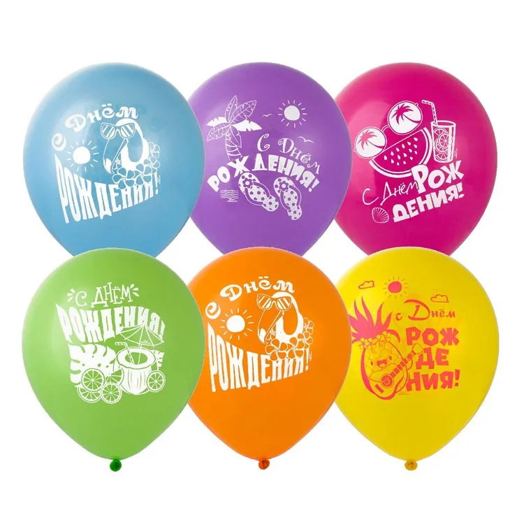 Высококачественный шар из натурального латекса. Ассорти из 10-12 цветов, типа пастель. Шары с двусторонним шелкографическим рисунком. Идеальный ассортимент для розничной продажи воздушных шариков.