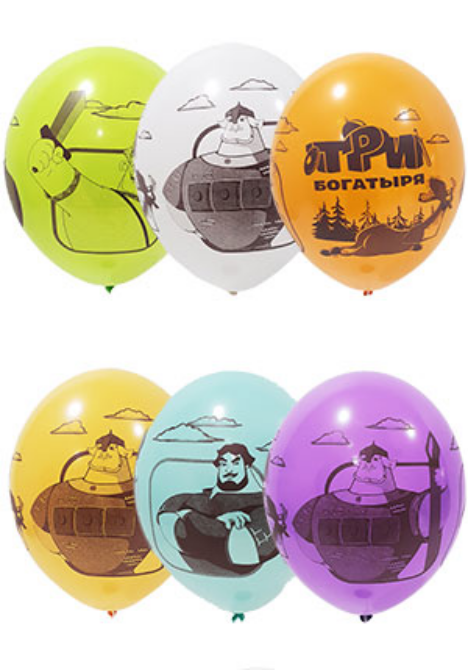 Высококачественный шар из натурального латекса. Ассорти из 5 цветов (в случайном соотношении), одного типа - пастель - матовый оттенок цвета. Шары с двусторонним шелкографическим рисунком (дизайны с любимыми детскими персонажами из мультфильма Три Богатыря) с большим полем печати. Идеальный ассортимент для розничной продажи воздушных шариков и украшения детских праздников.
