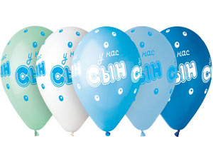Воздушные шары из натурального латекса c шелкографическим одноцветным рисунком в виде надписи У нас Сын в обрамдении воздушных пузырьков. Рисунок расположен по всей поверхности шара. В пакете шары 5 цветов бело-сине-голубой гаммы. Надпись в зависимости от цвета шара нанесена белой или синей краской. Предназначенны для использования как в оформлении, так и в розничной продаже. Размер шаров в надуве - 35 см, продаются ненадутыми, подходят для надува как гелием, так и воздухом при помощи ручного насоса.