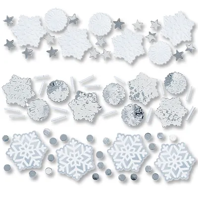 Серебряно-белое новогоднее конфетти выполнено в трех дизайнах: серебряные снежинки и белые снежные полоски; белые снежинки и серебряные зведы; бумажные серебряные шестиугольники с белыми снежинками и серебряные круги. Можно рассыпать конфетти на столе или под елку, или использовать для декорирования новогодних подарков. Вес: 34 гр.