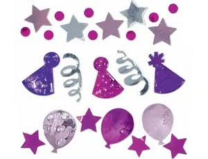 Разноцветное праздничное конфетти выполнено в трех дизайнах: розовые звездочки и малиновые круги; блестящие фиолетовые колпачки и серебряный серпантин; розовые и малиновые шарики.
