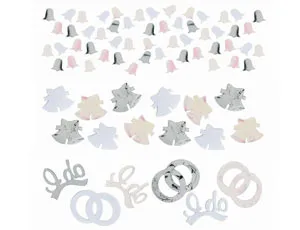 Белоснежные конфетти для тех, кто решил обвенчаться, представлено в трех дизайнах: серебряные, белые и перламутровые одинарные колокольчики; белые и серебряные двойные колокольчики с бантами; обручальные кольца и надпись I do (#Согласна/Согласен#). Конфетти можно рассыпать над головами проходящих молодоженов, положить в конверт с признанием в любви, добавить в подарок или в воздушный шарик. Вес упаковки: 34 гр.