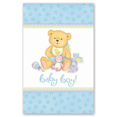 Бумажная скатерть для встречи новорожденного или празднования дня рождения малыша. Белая середина скатерти создана специально для того, чтобы на ней выделялась цветная посуда. На широкой канве скатерти расположился трогательный мишка с кубиками, погремушками и окантовкой в нежно-голубой горох.