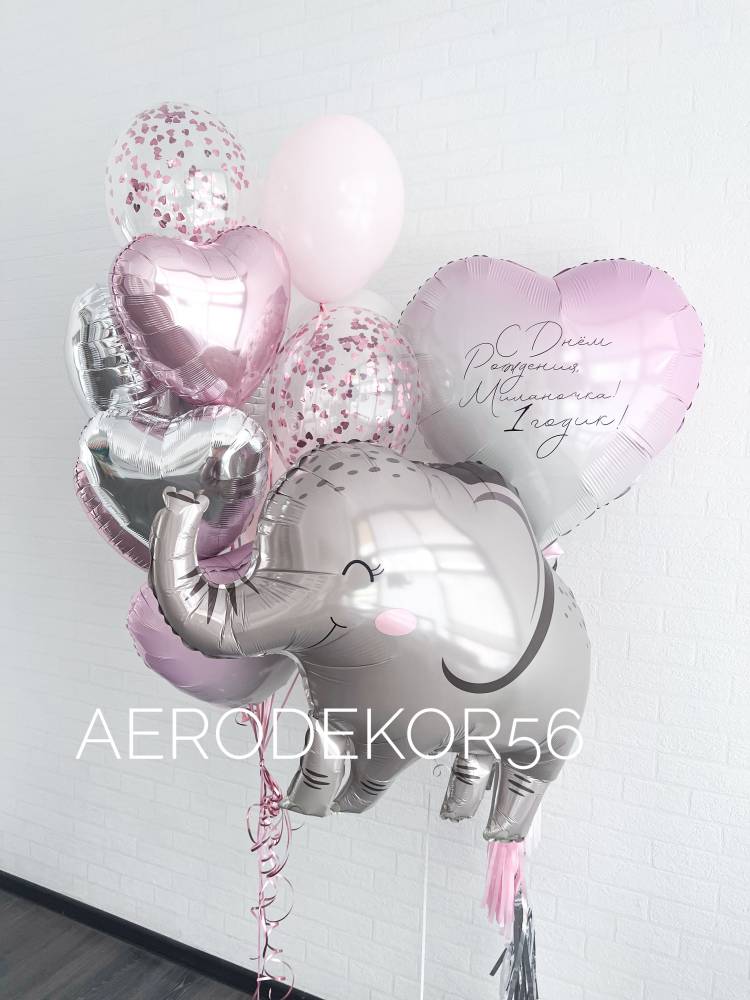 фольгированное сердце 5шт, латексный шар 2шт, шар с конфетти 2шт, фольгированный слоник 1шт, фольгированное сердце гигант с индивидуальной надписью 1 шт, грузик 3шт