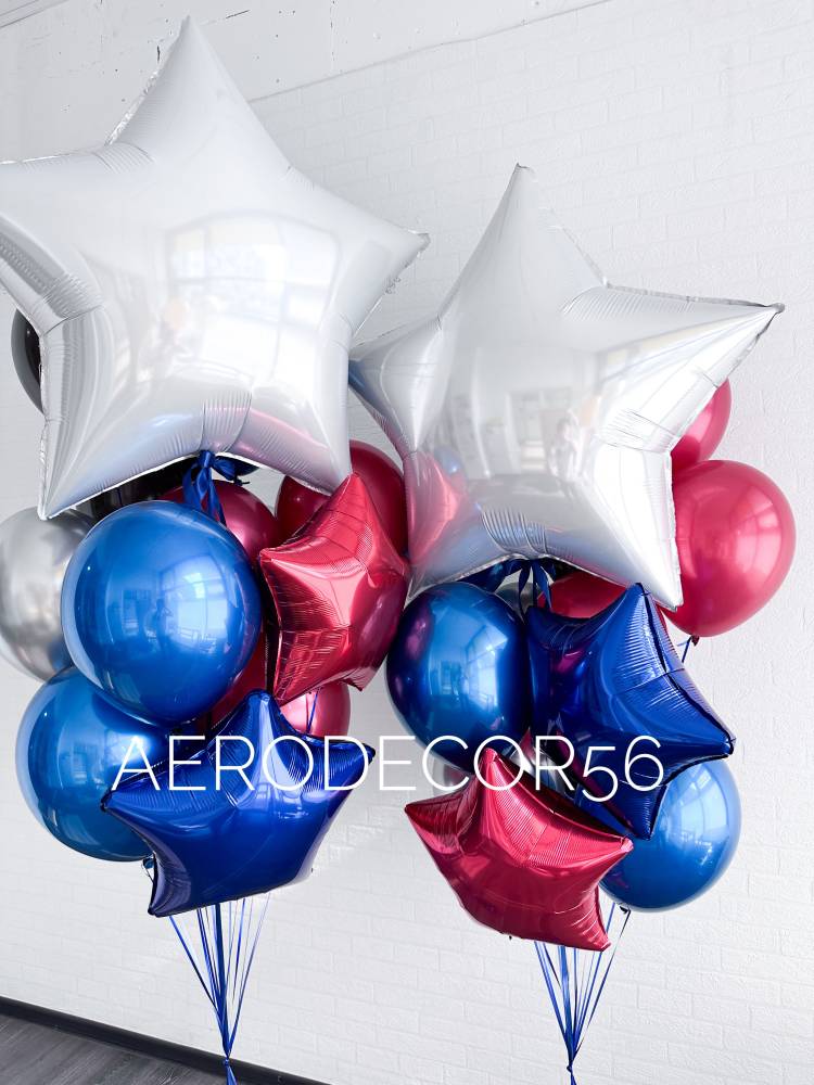 фольгированная звезда 4шт, фольгированная звезда гигант 2шт, шар хром 16шт, грузик 2шт
