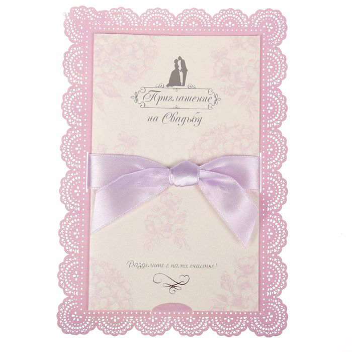 Когда дата и время бракосочетания уже известны, и вы определились со списком гостей, необходимо оповестить их о предстоящем празднике. Существует традиция делать персональные приглашения с указанием времени и даты мероприятия. Но перед свадьбой столько всего надо успеть, что на изготовление десятков открыток просто не остаётся времени. В этом случае вам придёт на помощь уникальное свадебное приглашение с бантом "Две судьбы станут одной...".