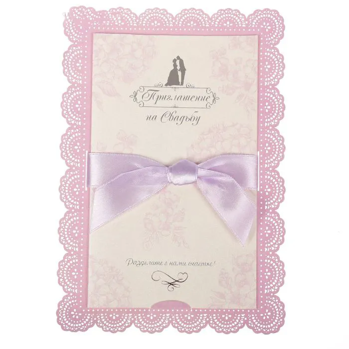 Оно выполнено в форме открытки. Материалы — дизайнерский картон и атласный бант. Карточка изготовлена с помощью лазерной резки, благодаря чему выглядит благородно. Текст со свободными полями для имени адресата, времени, даты и адреса проведения мероприятия напечатан на плотной бумаге, которая вкладывается в открытку.