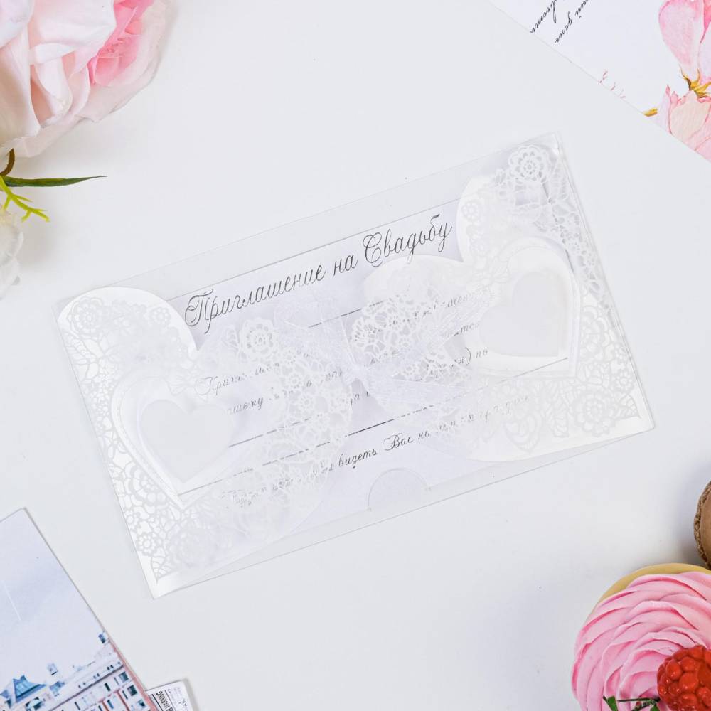 Оно выполнено в форме открытки. Материалы — дизайнерский картон и атласный бант. Карточка изготовлена с помощью лазерной резки, благодаря чему выглядит благородно. Текст со свободными полями для имени адресата, времени, даты и адреса проведения мероприятия напечатан на плотной бумаге, которая вкладывается в открытку.