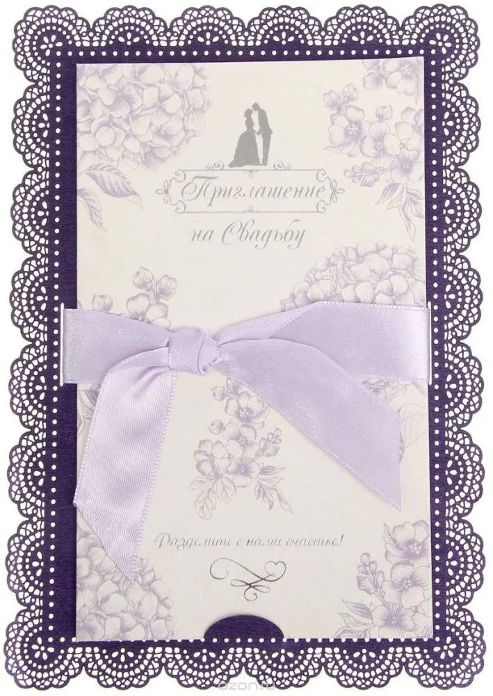 Оно выполнено в форме открытки. Материалы — дизайнерский картон и атласный бант. Карточка изготовлена с помощью лазерной резки, благодаря чему выглядит благородно. Текст со свободными полями для имени адресата, времени, даты и адреса проведения мероприятия напечатан на плотной бумаге, которая вкладывается в открытку.