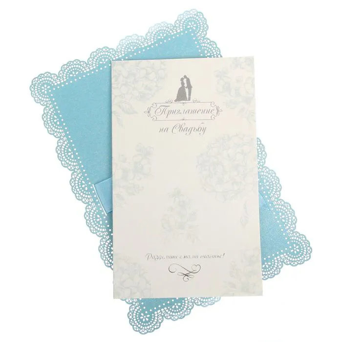 Оно выполнено в форме открытки из дизайнерского картона и украшено атласным бантом. Карточка голубого цвета изготовлена с помощью лазерной резки, благодаря чему выглядит очень изящно. Текст со свободными полями для имени получателя, времени, даты и адреса проведения мероприятия напечатан на плотной бумаге, которая вкладывается в открытку.