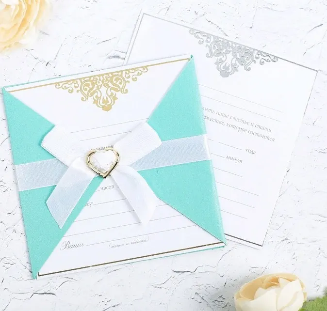 Когда дата и время бракосочетания уже известны, и вы определились со списком гостей, необходимо оповестить их о предстоящем празднике. Существует традиция делать персональные приглашения с указанием времени и даты мероприятия. Но перед свадьбой столько всего надо успеть, что на изготовление десятков открыток просто не остаётся времени. В этом случае вам придёт на помощь уникальное свадебное приглашение с бантом "Две судьбы станут одной...".