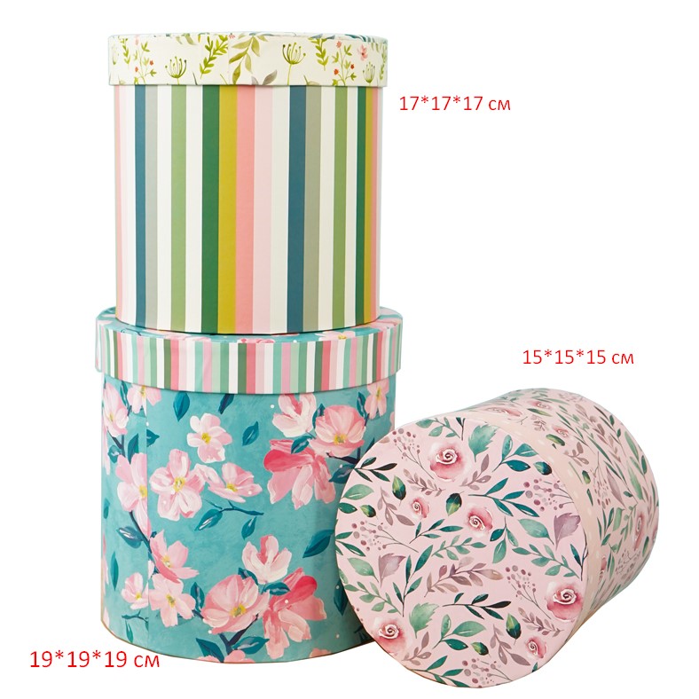 Коробки изготовлены из плотного картона, снаружи оклеены дизайнерской бумагой со стильным нежным принтом. Отличительная особенность набора- микс принтов, каждая коробка имеет свой дизайн.