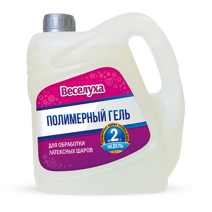 Полимерный гель ТМ «ВЕСЕЛУХА» продлевает время полёта латексных шаров до двух недель и более, при соблюдении норм, правил и условий использования геля.