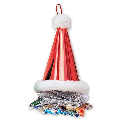 Карнавальный головной убор - блестящий красный колпак, похожий на шапку Деда Мороза, украшен белым помпоном и меховой опушкой понизу. Купить новогодний колпак можно в интернет-магазине и розничных магазинах.