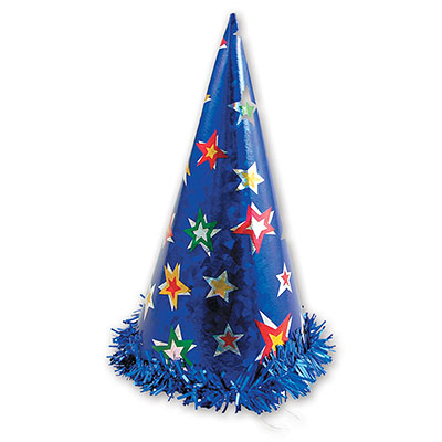 Карнавальный головной убор. Ярко-синий сказочный колпак Звездочёта с принтом из разноцветных звезд. Украшен сверкающей мишурой. Вы можете купить колпак как в нашем интернет-магазине, так и розничной сети Весёлой Затеи.