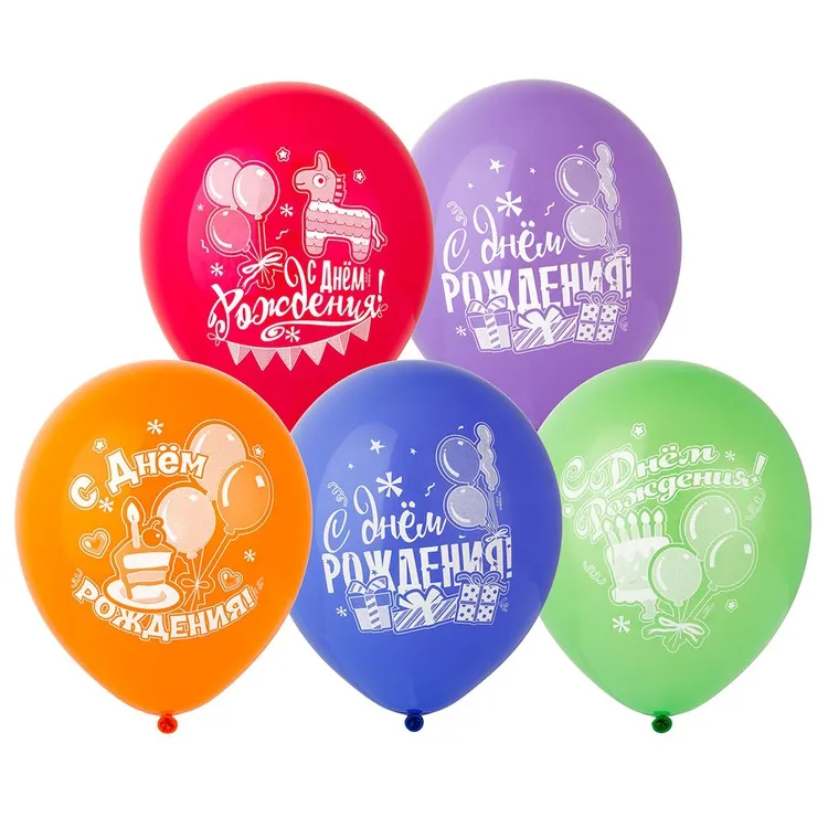 Высококачественный шар из натурального латекса. Ассорти из 10-12 цветов, типа пастель. Шары с двусторонним шелкографическим рисунком. Идеальный ассортимент для розничной продажи воздушных шариков.