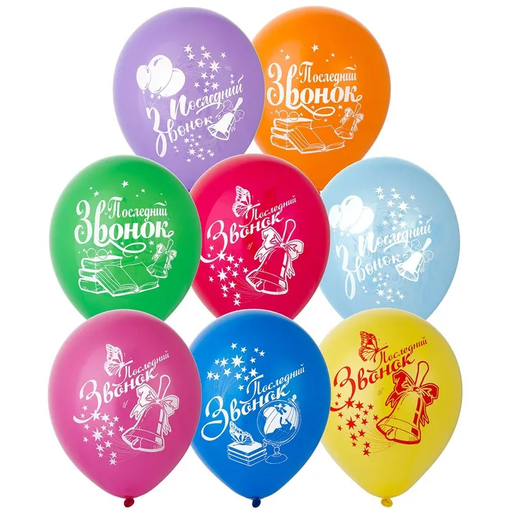 Шар с двусторонним рисунком из натурального латекса. Ассорти из 10-12 цветов (в случайном соотношении), одного типа - пастель - матовый оттенок цвета. Шары с двусторонним рисунком (5 дизайнов на тему "Последний звонок" в пакете) с большим полем печати. Идеальный а ссортимент для розничной продажи воздушных шариков и украшения праздника.