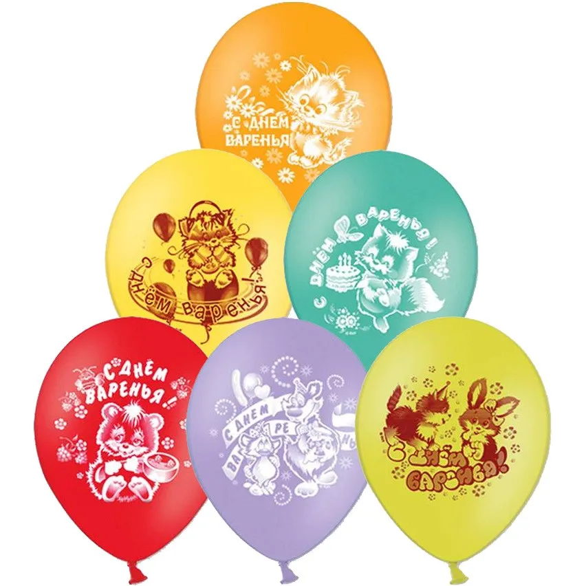 Высококачественный шар из натурального латекса. Ассорти из 10-12 цветов, типа пастель. Шары с двусторонним шелкографическим рисунком. Идеальный ассортимент для розничной продажи воздушных шариков.