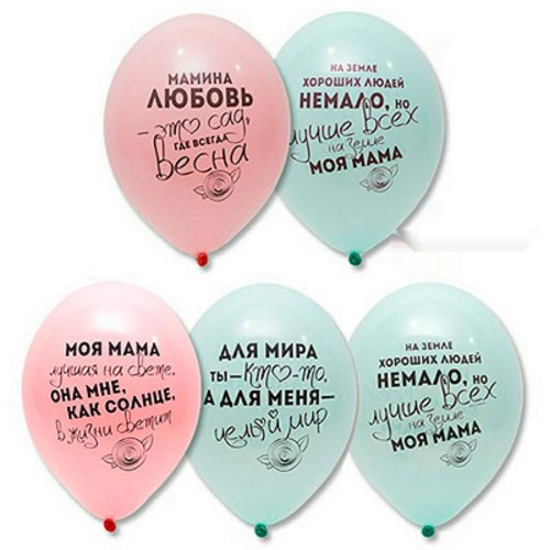 Высококачественный шар из натурального латекса. Ассорти из нескольких цветов. Одного типа - пастель - матовый оттенок цвета. Шары с двусторонним шелкографическим рисунком повсященных Маме, в пакете с большим полем печати. "На земле хороших людей немало, но лучше всех на земле моя мама", "Мамина Любовь - это сад, где всегда весна", "Моя мама лучшая на всете, она мне как в солнце в жизни светит", "Для мира ты кто-то, а для меня - целый мир", "Я не лучший из детей, но ты - лучшая из мам". Идеальный ассортимент для розничной продажи воздушных шариков и украшения праздника.