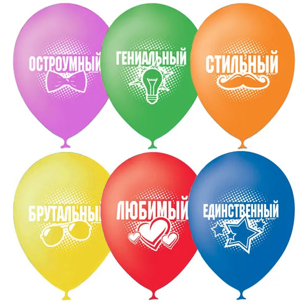 Высококачественный шар из натурального латекса. Ассорти из 10-12 цветов, типа пастель. Шары с двусторонним шелкографическим рисунком. Идеальный ассортимент для розничной продажи воздушных шариков.