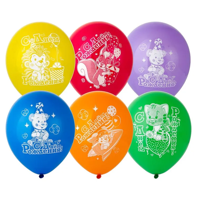 Высококачественный шар из натурального латекса. Ассорти из 10-12 цветов, типа пастель. Шары с двусторонним шелкографическим рисунком. Идеальный ассортимент для розничной продажи воздушных шариков.