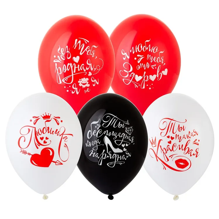 Высококачественный шар из натурального латекса. Красные, белые, черные пастель - матовый оттенок цвета. Шары с двусторонним шелкографическим рисунком и текстами о Любви! Идеальный ассортимент для розничной продажи воздушных шариков и украшения праздника. Воздушные шары изготавливаются из экологически безопасного 100%-ного натурального латекса. В окружающей среде разлагаются на безопасные компоненты примерно с той-же скоростью, как обычные листья деревьев. После использования лопнуть и утилизировать как бытовой отход. Любовь, Валентинов День