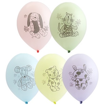 Высококачественный шар из натурального латекса. Ассорти из 5 нежных цветов макарунс, одного типа - пастель - матовый оттенок цвета. Шары с двусторонним шелкографическим рисунком. 5 дизайнов - симпатичные Зверюшки-Игрушки. Большое поле печати. Идеальный ассортимент для розничной продажи воздушных шариков и украшения детских праздников.