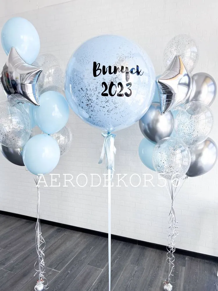 стеклянный шар гигант с индивидуальной надписью 1шт, шар 12д 6шт, шар хром 12д 6шт, шар с конфетти 12д 6шт, звезда 18д 2шт, грузик 3шт