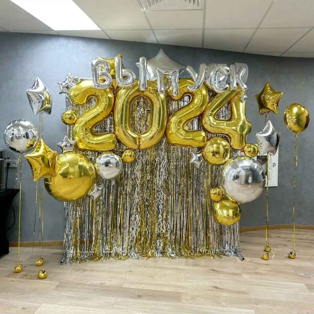 разнокалиберная гирлянда с добавлением хромированных шаров 7м, фольгированая цифра 4шт, шар хром18д на леске с мелкими шариками 5шт,грузики 9шт