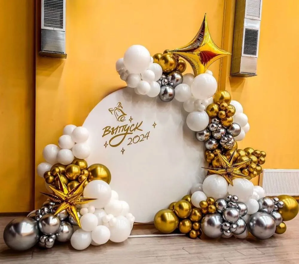разнокалиберная гирлянда с добавлением хромированных шаров 7м, фольгированая цифра 4шт, шар хром18д на леске с мелкими шариками 5шт,грузики 9шт