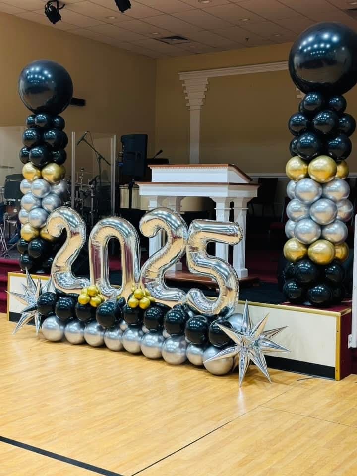 разнокалиберная гирлянда с добавлением хромированных шаров 7м, фольгированая цифра 4шт, шар хром18д на леске с мелкими шариками 5шт,грузики 9шт