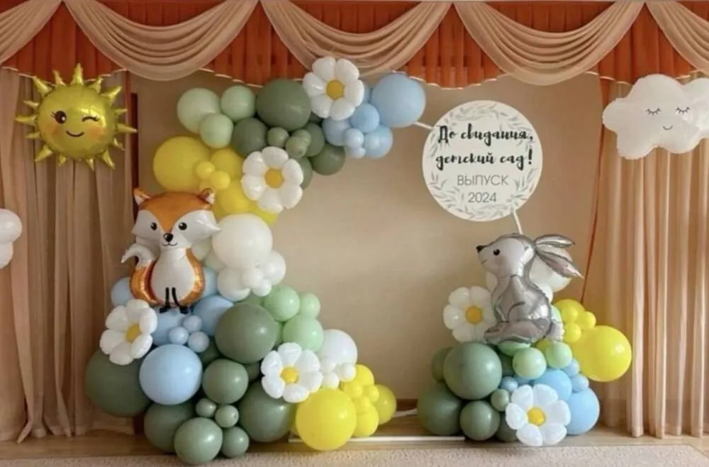 разнокалиберная гирлянда с добавлением хромированных шаров 7м, фольгированая цифра 4шт, шар хром18д на леске с мелкими шариками 5шт,грузики 9шт