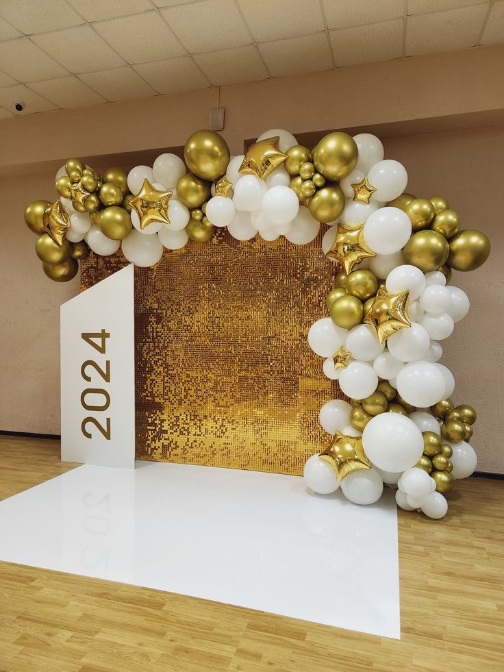 разнокалиберная гирлянда с добавлением хромированных шаров 7м, фольгированая цифра 4шт, шар хром18д на леске с мелкими шариками 5шт,грузики 9шт