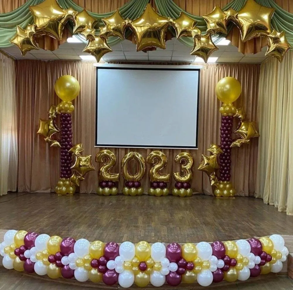 разнокалиберная гирлянда с добавлением хромированных шаров 7м, фольгированая цифра 4шт, шар хром18д на леске с мелкими шариками 5шт,грузики 9шт