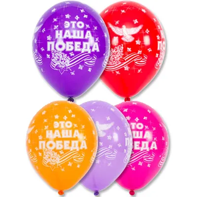 Высококачественный шар из натурального латекса. Ассорти из 10-12 цветов в случайном соотношении), одного типа - пастель - матовый оттенок цвета. Шары с пятисторонним - круговая печать, шелкографическим рисунком на тему "День Победы", "9 Мая", "Салют", "Это наша Победа". Предназначен для розничной продажи воздушных шариков. Идеальный ассортимент для праздничных оформлений, т.к. при плетении из него гирлянд - рисунок будет очень хорошо виден.