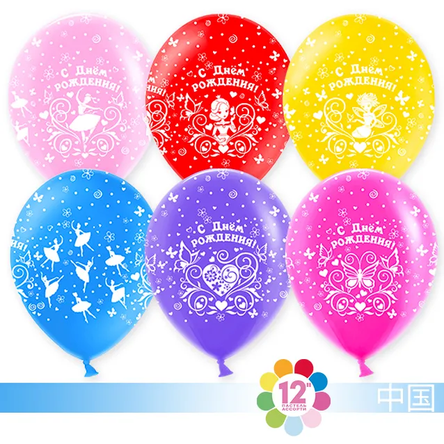 Высококачественный шар из натурального латекса, китайского производства, под торговой маркой "Веселый праздник", ассорти из 8 -9 цветов: желтого, красного, оранжевого, голубого, сиреневого, фиолетового, розового и фуше (в случайном соотношении), одного типа - пастель (матовый оттенок цвета). Шары с пятисторонним шелкографическим рисунком. Идеальный ассортимент для розничной продажи воздушных шаров и украшения праздника.