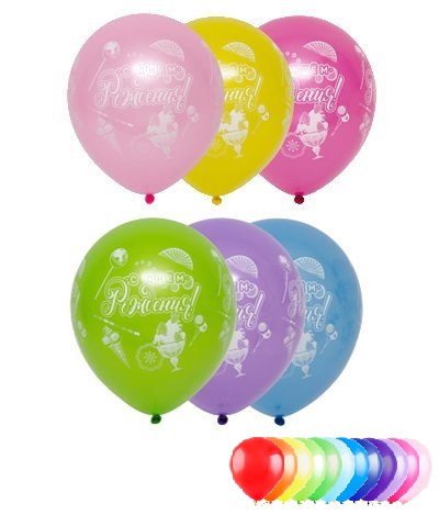 Шары из натурального латекса c шелкографическим рисунком одного цвета. Печать с четырех сторон. Все шары одного дизайна. Тип шара пастель - матовый оттенок цвета. Ассорти из 8-10 цветов. Предназначенны для использования в розничной продаже как в надутом, так и в не надутом виде.
